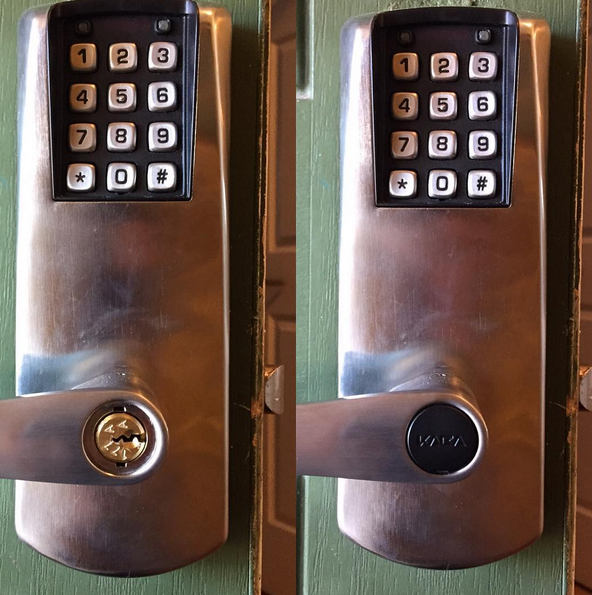 Installing a brand new Kaba E-Plix push pad lever lock with a restricted over ride key for one of our account customers for a local property managment company.