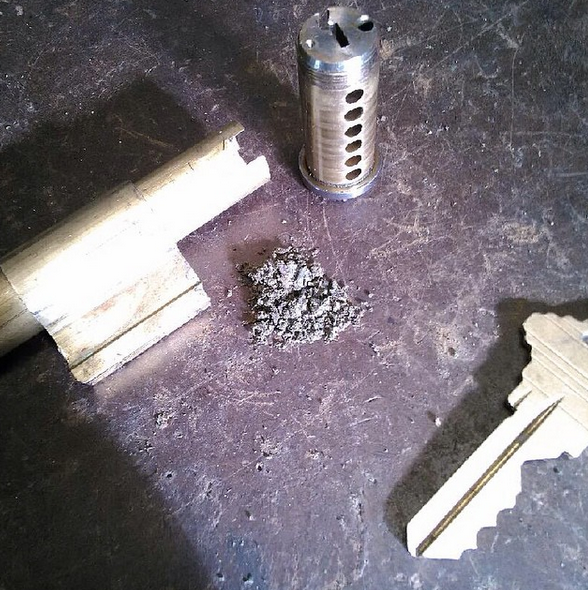 One of our professional locksmith Eric just finished rekeying a concrete distributing warehouse and he said all thier locks were impacted with cement dust. This was just some of dust pulled out of the deadbolt lock on the mixing room door. Luckily he was
